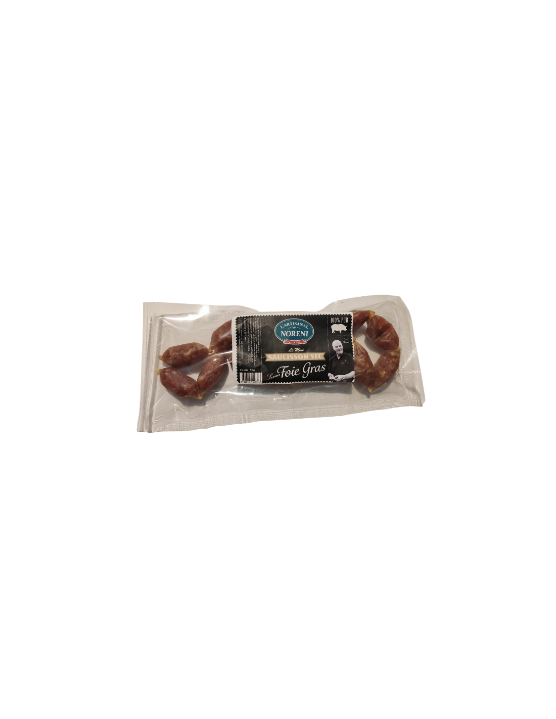 Composition : viande et gras de Porc des Hauts de France 94%, arôme et bloc de foie gras 6%, sel, lactose, dextrose, épices, ferments lactiques conservateur : salpêtre, boyau collagène comestible. Produit sujet à dessiccation