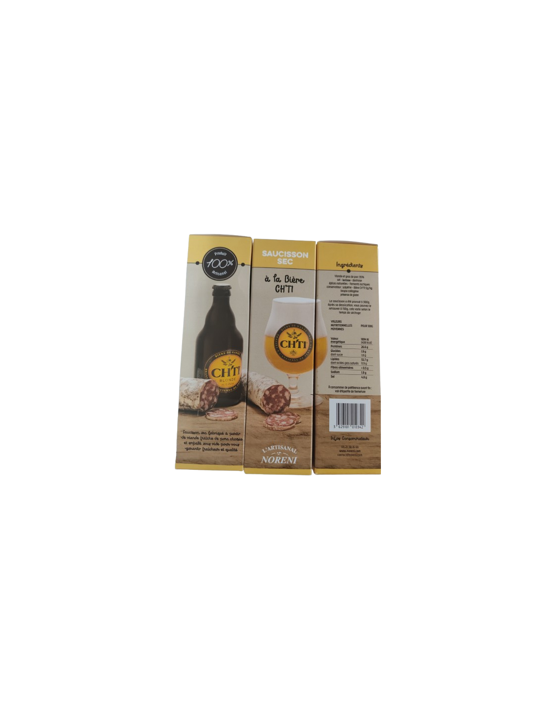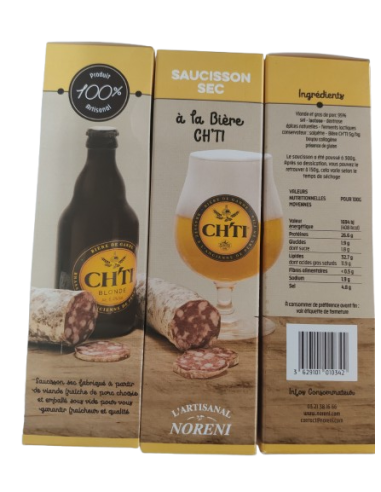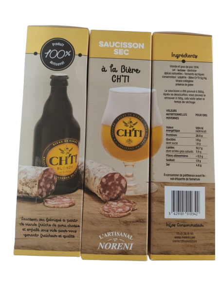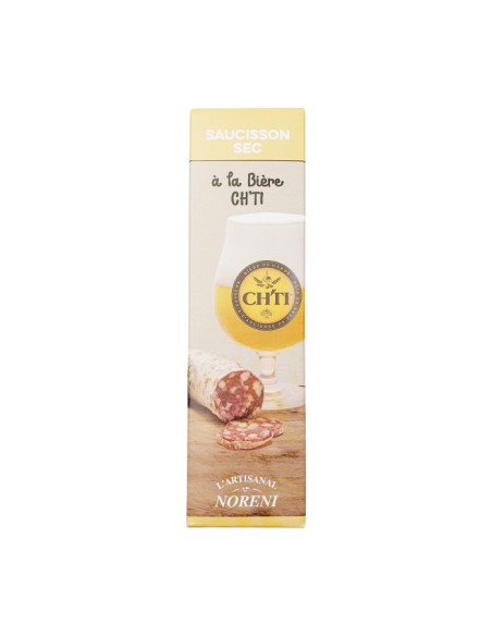 Saucisson sec pur porc à la bière du Ch'ti fabriqué à partir de viande de porcs nés, élevés et nourris dans les Hauts de France. Emballé sous vide, garantie fraîcheur et qualité. Produit artisanal. Affiné lentement dans nos séchoirs au pied de la forêt d'Eperlecques dans le Pas-de-Calais.