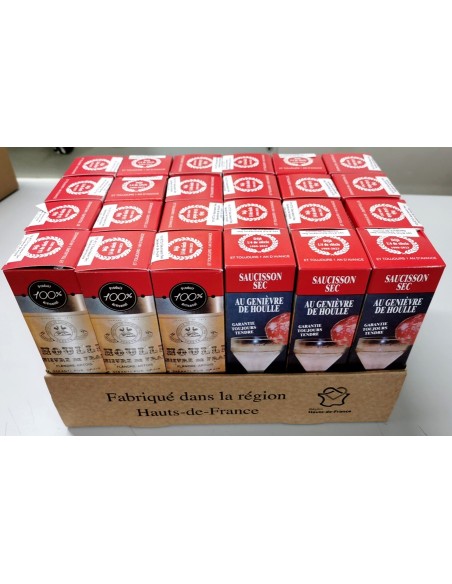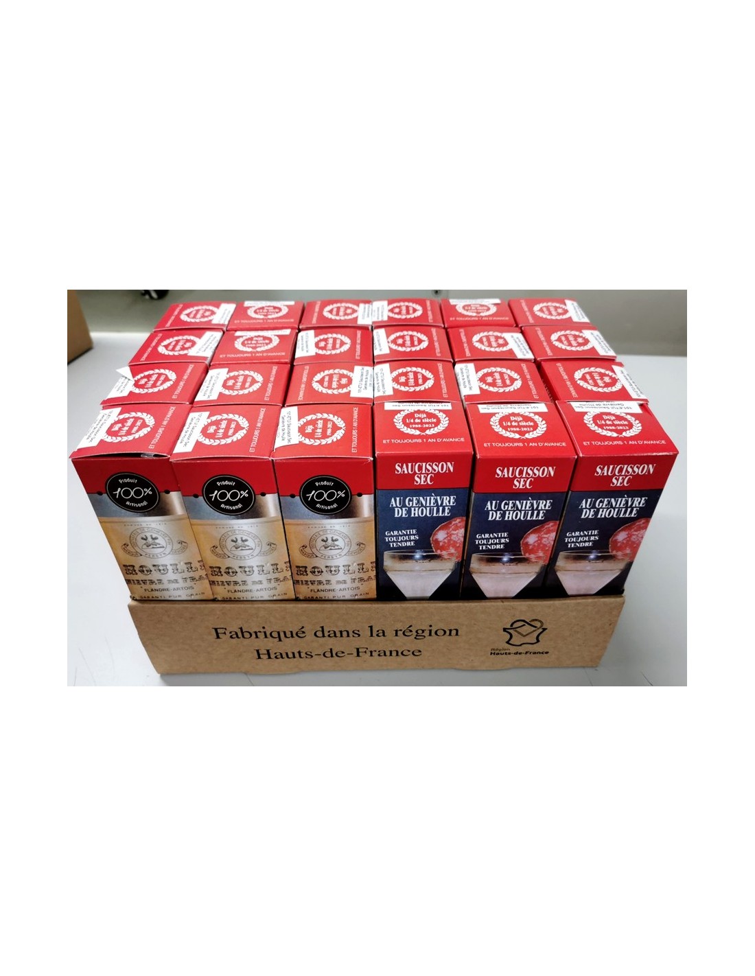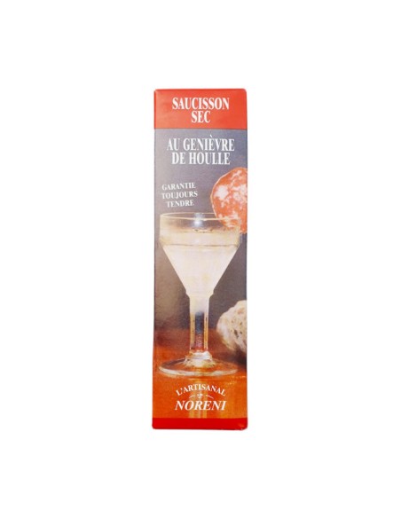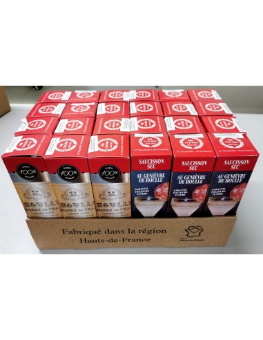 Saucisson sec pur porc au Genièvre de Houlle fabriqué à partir de viande de porcs nés, élevés et nourris dans les Hauts de France. Emballé sous vide, garantie fraîcheur et qualité. Produit artisanal. Affiné lentement dans nos séchoirs au pied de la forêt d'Eperlecques dans le Pas-de-Calais.
